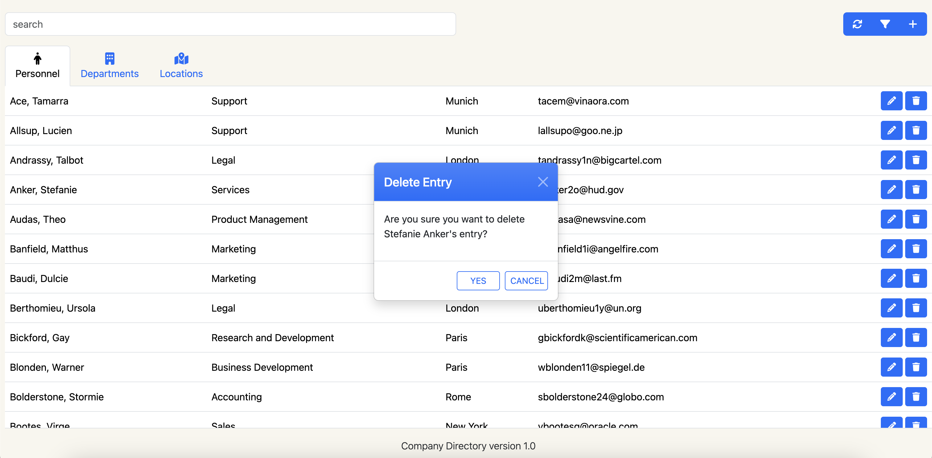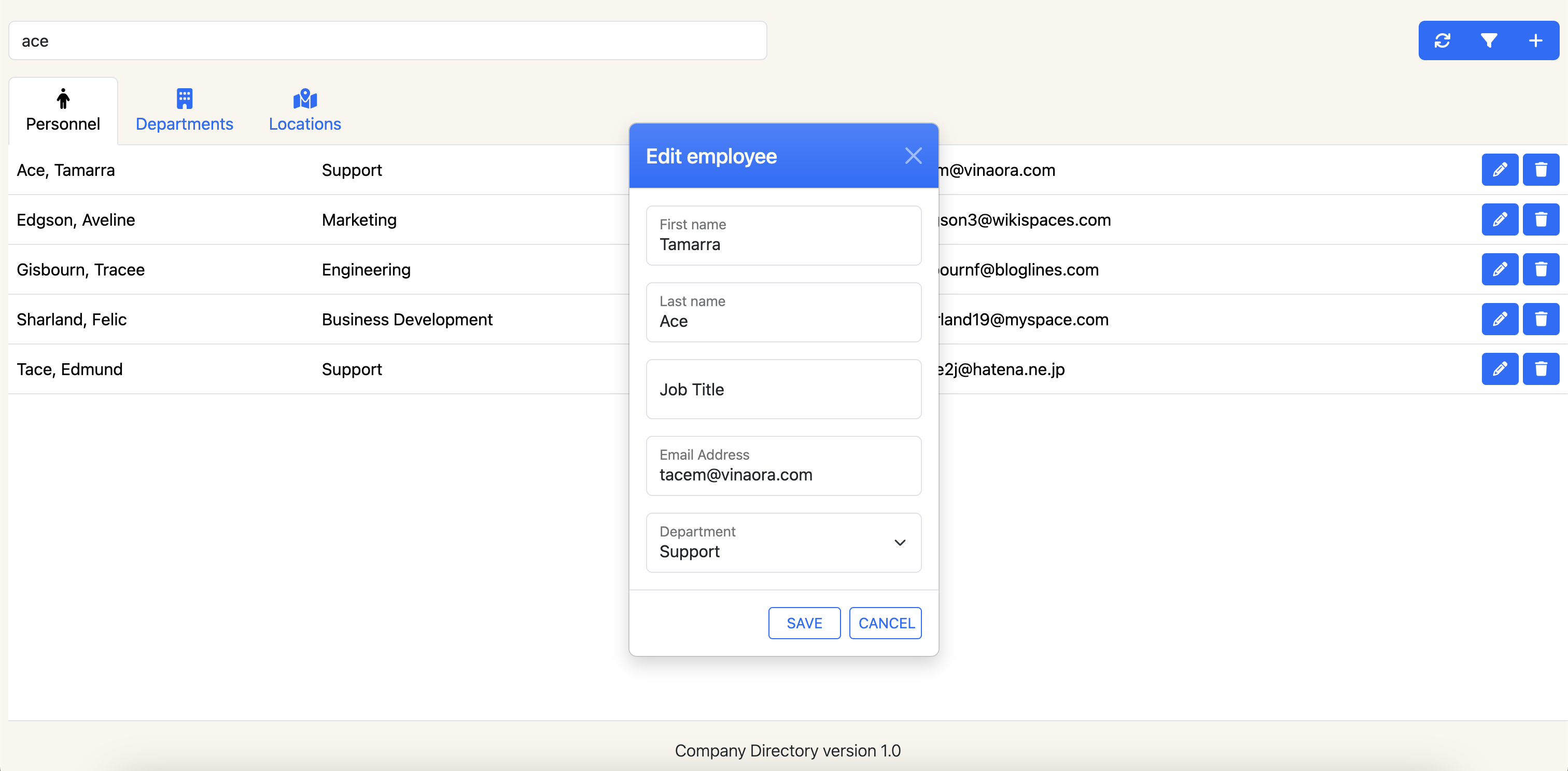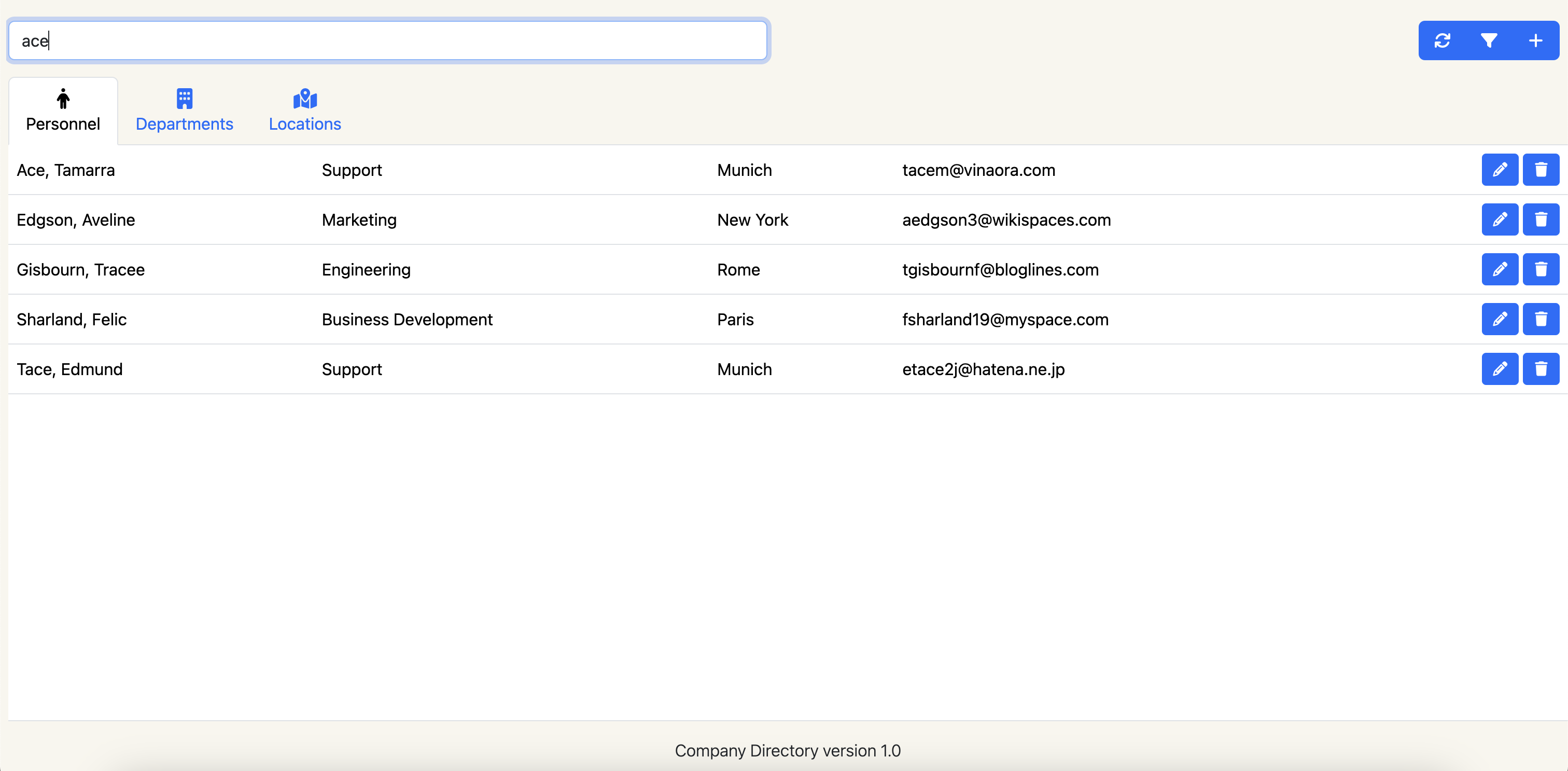 Company Directory is a web app created using JavaScript, PHP and MySQL. It allows users to view, search, insert, update and delete data from a database.